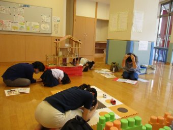 ↑途中、みんなでだんご虫ポーズをやってみたり、いざという時にお家でもできる