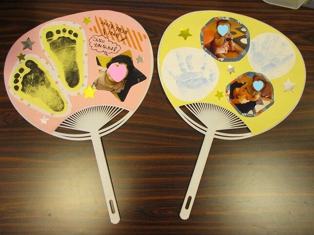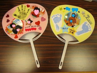 うちわづくりの説明に入り、写真を撮ったり、手型足型を一緒に取ったり、