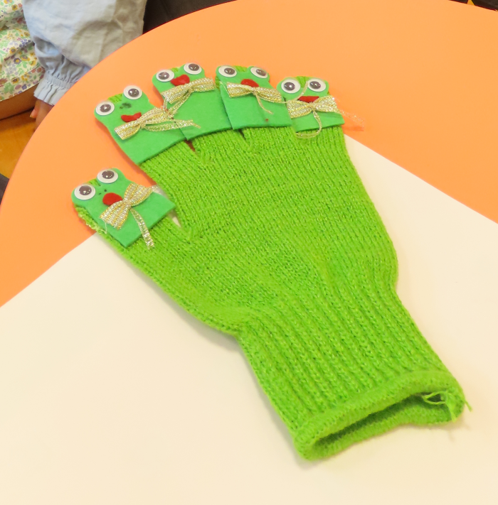 そして、カエルさんを手袋の指の部分にくっつけていくと…ケロちゃん手袋の完成です!